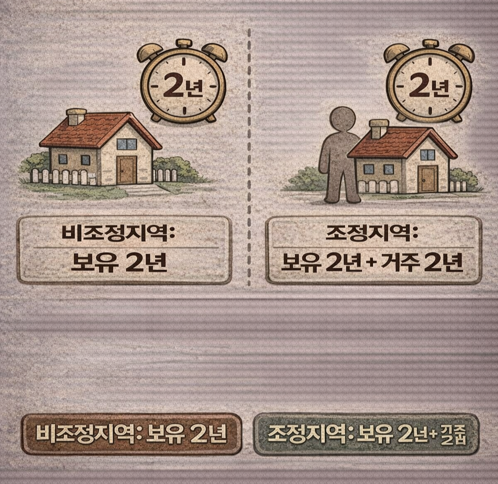 조정대상지역에 위치한 주택의 경우, 단순 보유 2년만으로는 비과세가 되지 않고 거주 2년 요건이 추가로 요구됩니다.