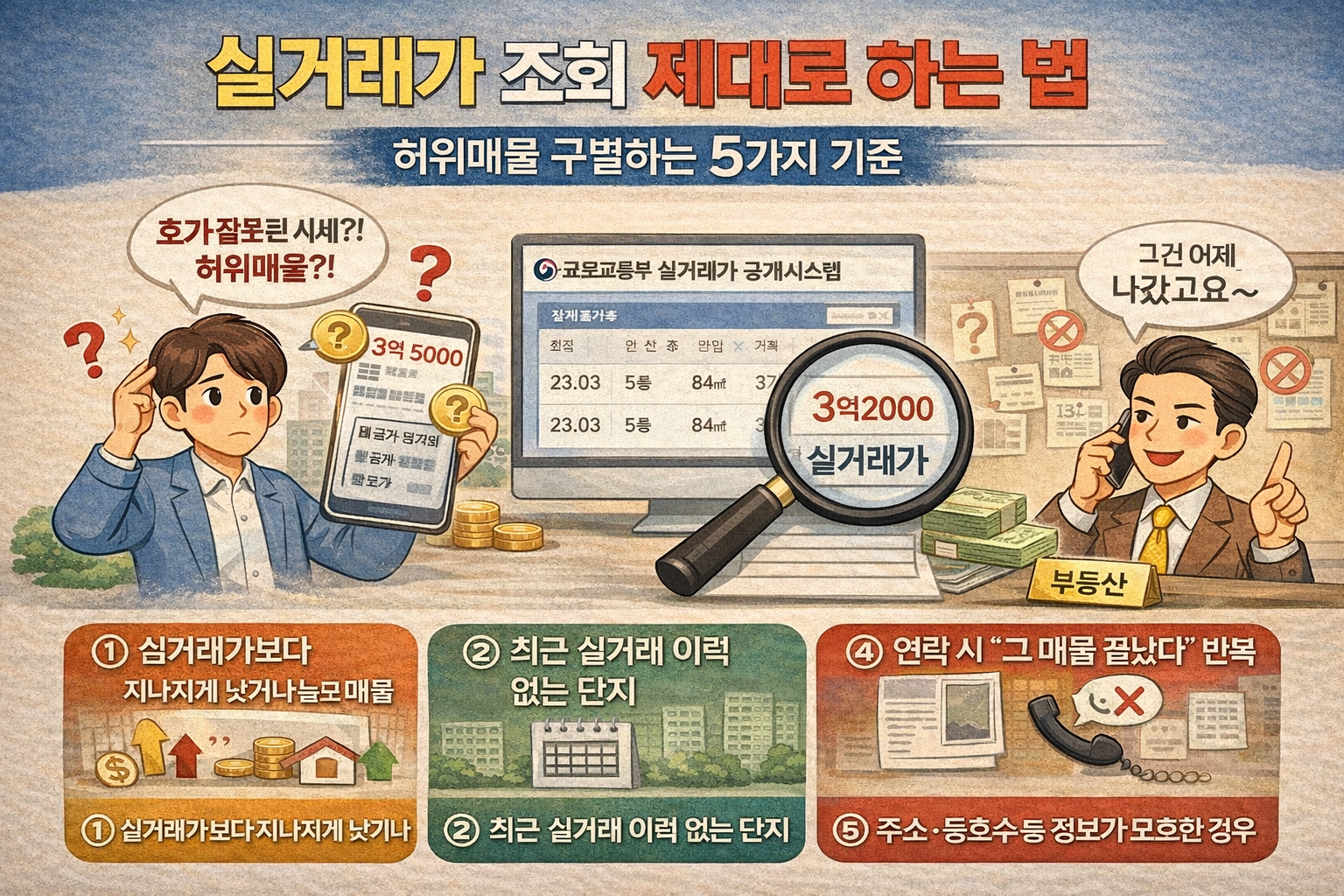 부동산 시장에서 ‘실거래가’는 가장 믿을 수 있는 가격 지표입니다. 하지만 조회 방법을 잘 모르거나, 허위매물과 섞여 혼란을 겪는 경우가 많습니다. 이 글에서는 국토교통부 실거래가 공개 시스템부터 호갱노노, 네이버 부동산 등 플랫폼별 활용법을 정리하고, 실거래가를 통해 허위매물을 구별하는 기준 5가지를 알려드립니다. 실전 거래 전 꼭 알아야 할 정보만 담았습니다.