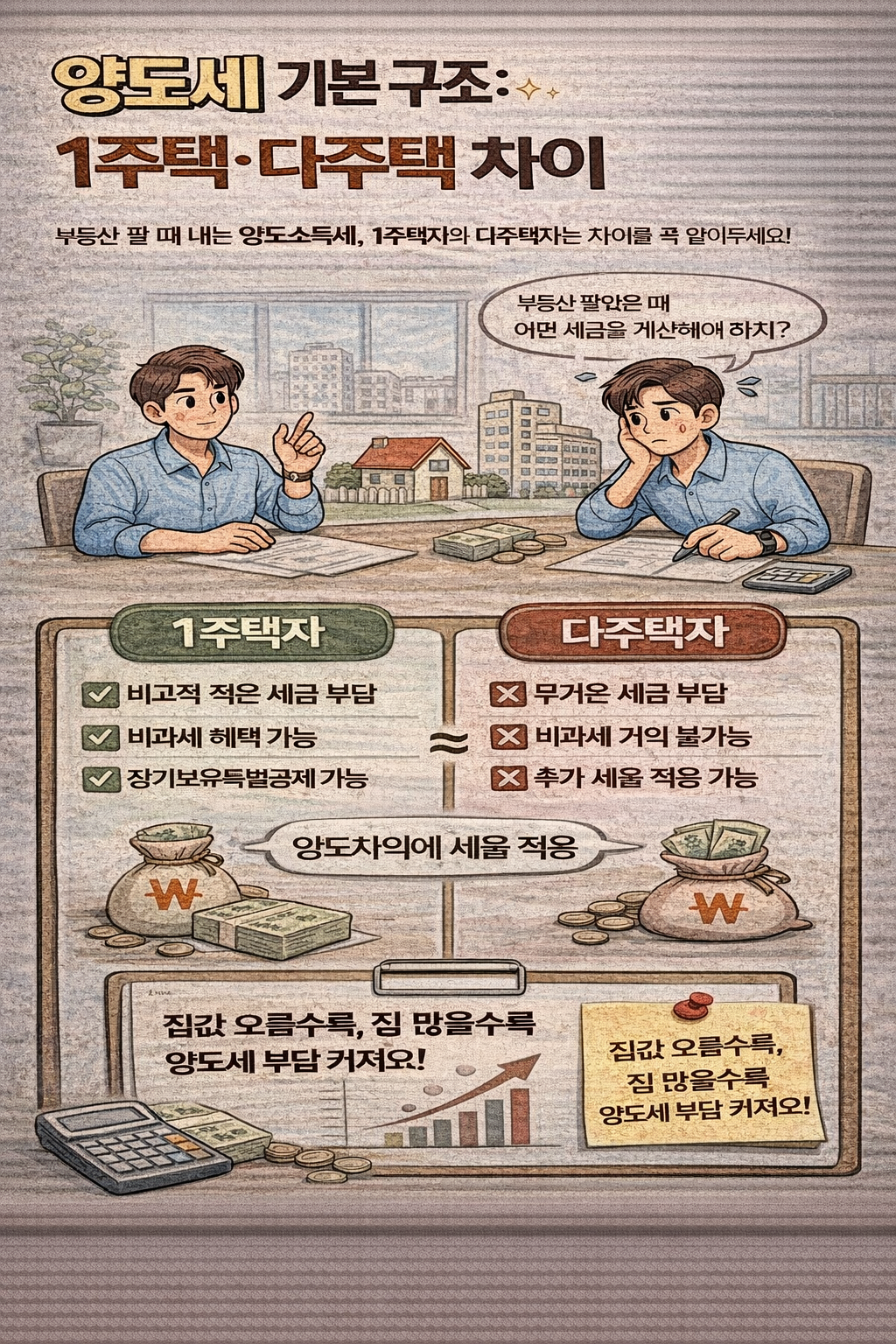 전월세나 실거주 목적이든, 투자 목적이든 부동산을 보유하다 보면 언젠가는 ‘팔게 되는 순간’을 맞이하게 됩니다. 이때 반드시 따라오는 세금이 바로 양도소득세입니다. 양도세는 이름만 들어도 어렵게 느껴지지만, 구조만 제대로 이해하면 생각보다 단순합니다. 특히 1주택자와 다주택자의 과세 방식 차이는 실제 세금 부담에서 매우 큰 차이를 만들어내기 때문에 반드시 구분해서 이해해야 합니다.