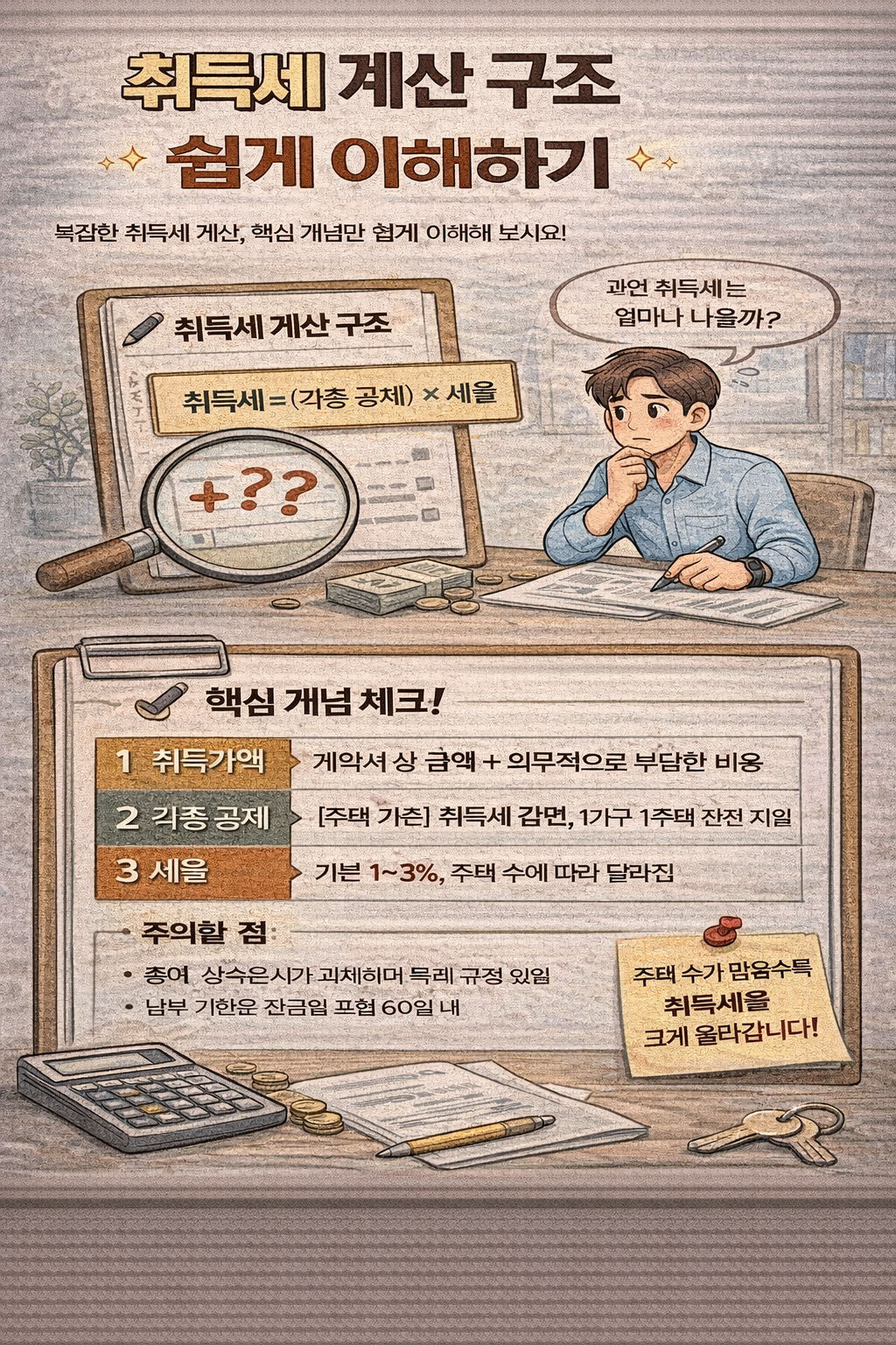 부동산을 처음 취득할 때 가장 먼저 마주하는 세금이 바로 취득세입니다. 집을 사고, 땅을 사면 당연히 세금을 내야 하는데요, 생각보다 계산이 복잡하고 세율도 상황에 따라 달라집니다. 오늘은 취득세의 기본 구조와 계산 방법을 쉽게 정리해드립니다.